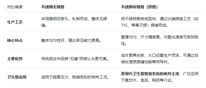要做出正确选择,首先需要明白,“卫生级”是一个关于材质纯净度、表面光洁度和工艺卫生的标准,而非指管道成型工艺。 符合标准的不锈钢管,既可以是无缝管,也可以是有缝管(即焊管),二者在性能和应用上各有侧重。