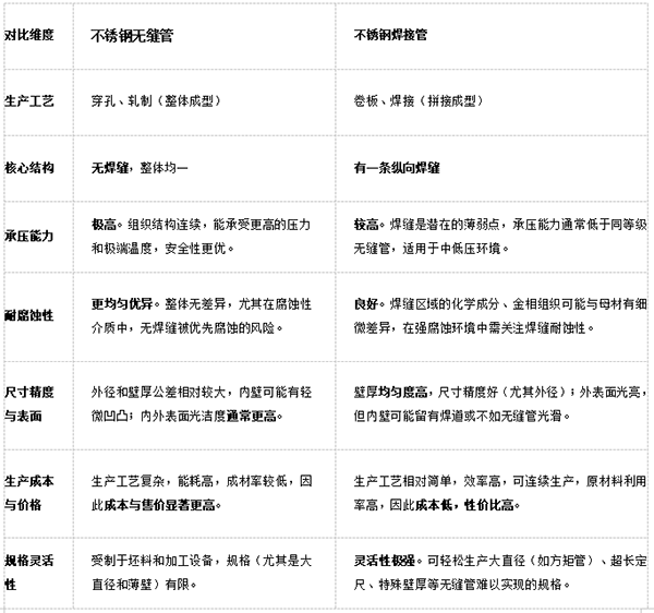 在工业与建筑领域,选择不锈钢无缝管还是不锈钢焊管,往往令不少专业人士与采购者纠结。这两种看似相似,实则“内外有别”的管材,其差异远不止于有无焊缝。为了帮助您清晰理解,我们先通过一个概览表,快速抓住它们最核心的区别。